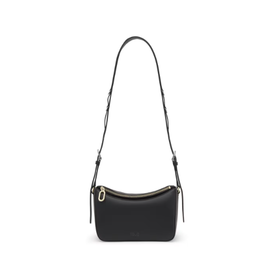 Bolso bandolera mediano TOUS City de poliuretano en color negro. Cierre de imán. Bolsillo exterior cremallera y bolsillo interior cremallera. Asa bandolera ajustable.