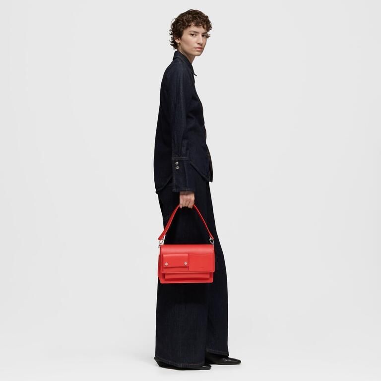 Bolso bandolera mediano Audree TOUS Pockets de poliuretano en color rojo. Incorpora una solapa y cierre con dos botones magnéticos. Cuenta con dos compartimentos separados por uno con cremallera y un bolsillo abierto en la parte delantera. Asa de hombro fija y asa bandolera ajustable y desmontable. Medidas (alto x ancho x fondo): 19 x 25 x 12 cm