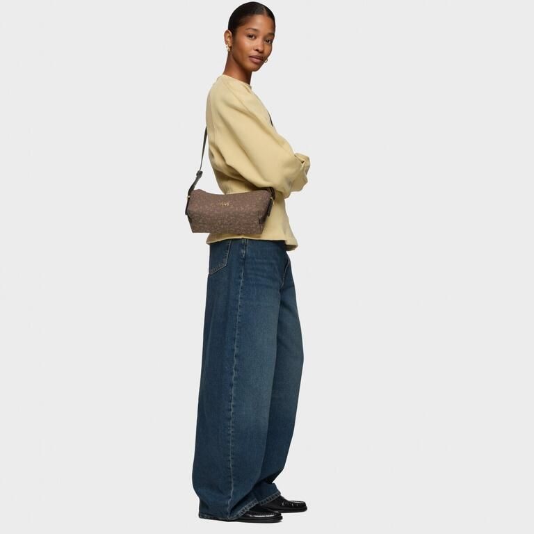 Bolso bandolera mediano Kaos Mini Lines de lona con detalles de poliuretano en color marrón. Cierre de cremallera. Bolsillo interior con cremallera. Asa bandolera ajustable. Medidas (alto x ancho x fondo): 14,5 x 27 x 10,5 cm.