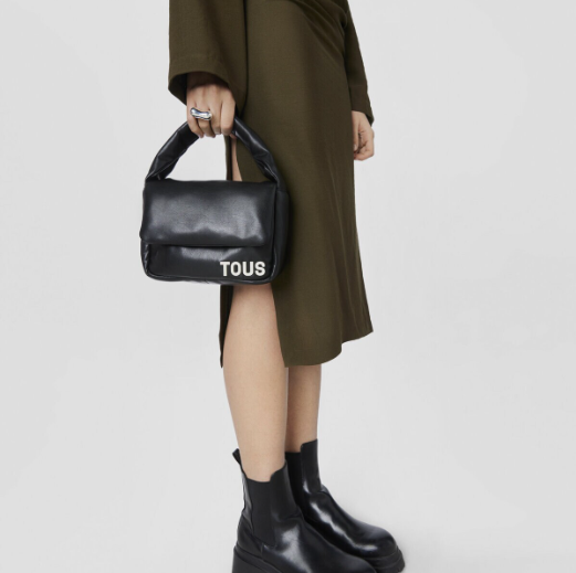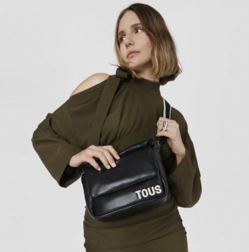 Bolso bandolera pequeño TOUS Carol de piel sintética en color negro. Cierre con solapa y dos botones magnéticos. Asa fija de hombro o mano y asa bandolera ajustable y extraíble.