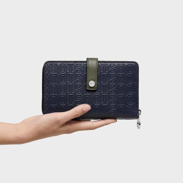 Billetera Urbana Logo New de piel con certificación LWG en color azul marino. Cuenta con dos compartimentos. Uno de ellos con cierre de botón a presión, trece ranuras para tarjetas y tres espacios abiertos para billetes. El otro, con cierre de cremallera dispone de tres espacios abiertos para monedas.