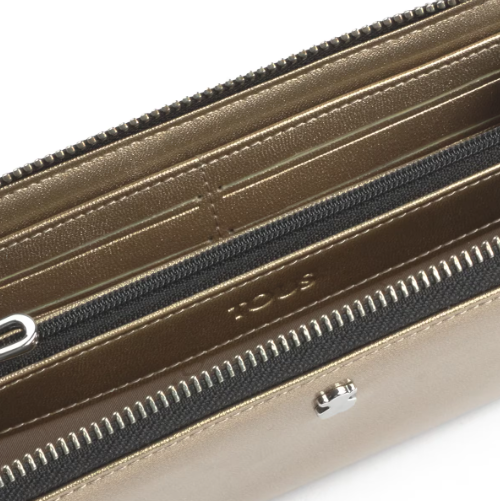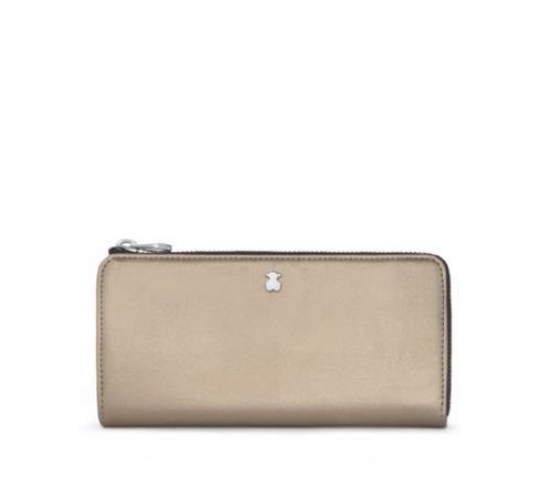 Billetera mediana TOUS colección Dorp de vinilo efecto piel con acabado charol en color dorado. Cierre con cremallera. Apliques personalizados en tono dorado pálido. Compartimento central con cremallera, ocho compartimentos para tarjetas y dos bolsillos planos.