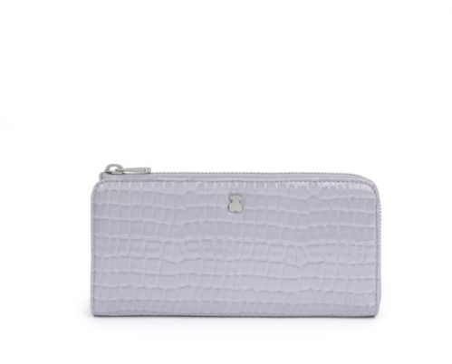 Billetera mediana TOUS colección Dorp de vinilo efecto piel exótica en color lila. Cierre con cremallera. Apliques personalizados en tono dorado pálido. Compartimento central con cremallera, ocho compartimentos para tarjetas y dos bolsillos planos.