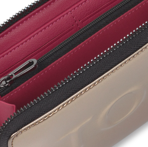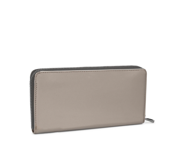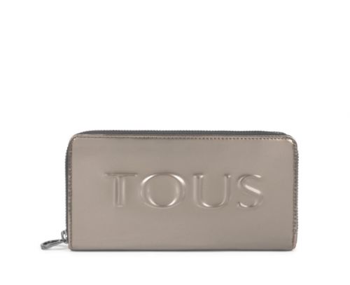 Billetera mediana TOUS de la colección Grata Dorp, en vinilo de efecto piel y acabado charol con relieve TOUS en color gris y fucsia. Cierre con cremallera. Compartimento central con cremallera, ocho compartimentos para tarjetas y dos bolsillos planos.