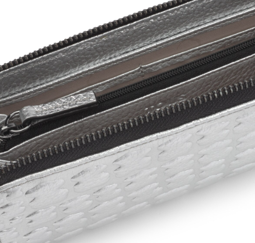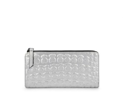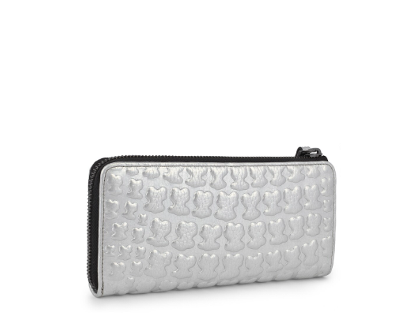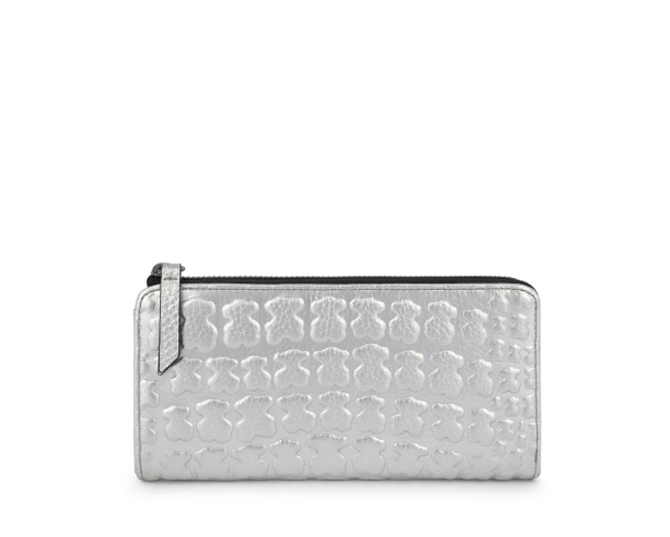 Billetera mediana TOUS colección Sherton de piel grabada en color plata. Cierre con cremallera. Apliques personalizados en tono pavonado pálido. Compartimento central con cremallera, ocho compartimentos para tarjetas y dos bolsillos planos.