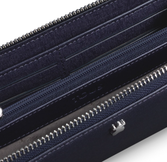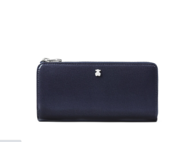 Billetero mediano Tous Dorp de vinilo efecto charol en color azul. Interior: ocho departamentos para tarjetas, un departamento con cremallera y cuatro departamentos para varios.