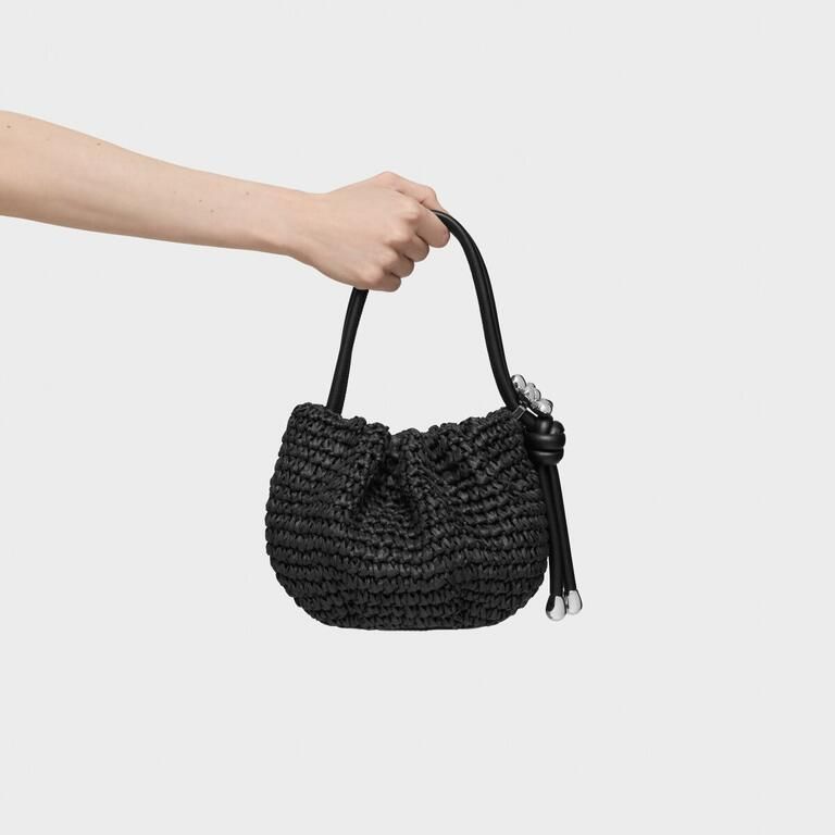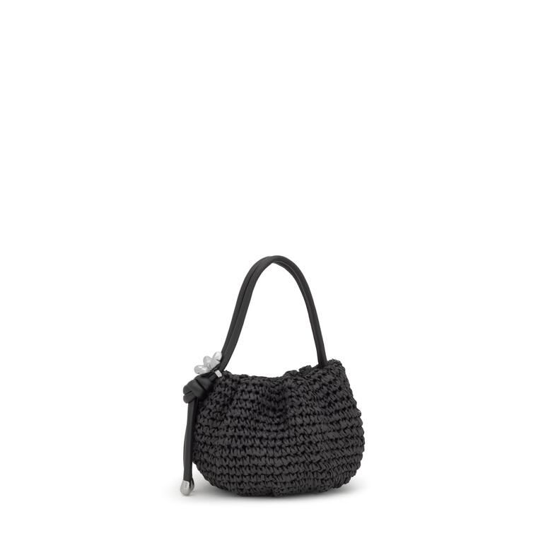 Bolso bombonera TOUS Daisy de rafia hecha de papel y detalles de poliuretano en color negro. Cierre magnético. Asa de mano ajustable y asa bandolera ajustable y extraíble.