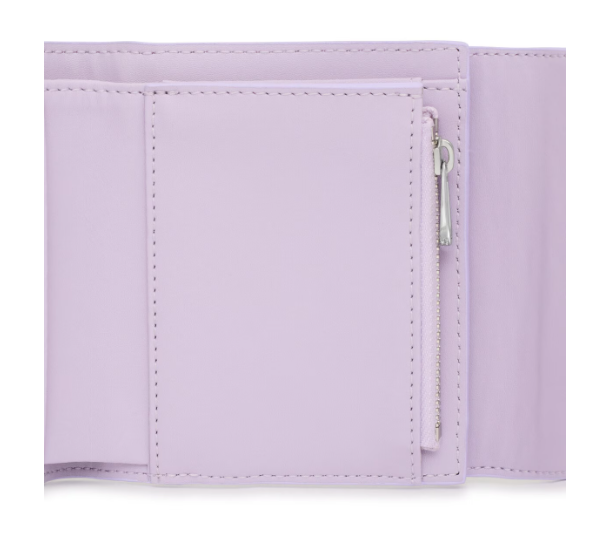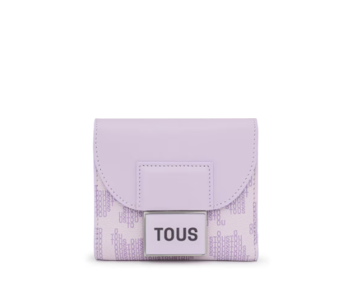 Cartera Flap TOUS Kaos Pix de lona con estampado en color malva. También incorpora detalles de piel sintética. Cierre de solapa con botón a presión. En el interior cuenta con un compartimento abierto para billetes, un bolsillo con cremallera para monedas y cinco ranuras para tarjetas.
