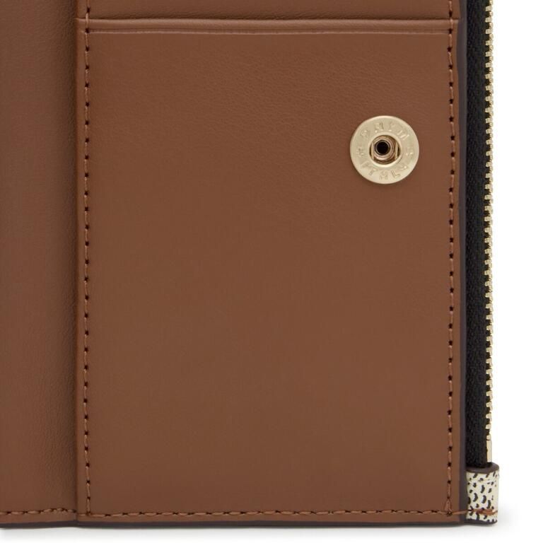 Cartera beige de lona con estampado Kaos Icon. Cierre de botón a presión. Tiene un compartimento para monedas con cierre de cremallera. En el interior cuenta con ocho ranuras para tarjetas y dos espacios para billetes.