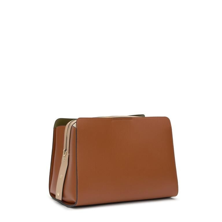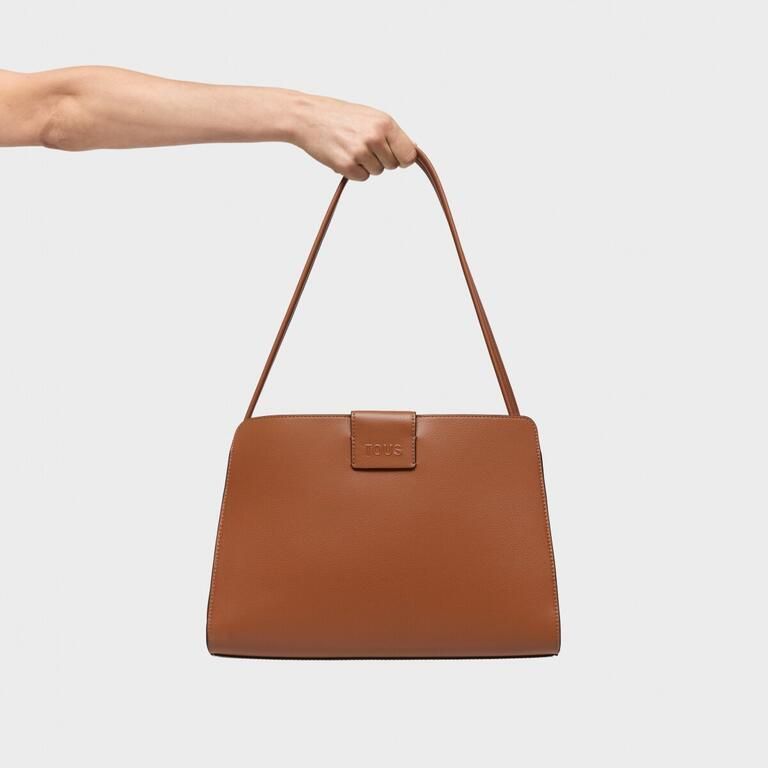 Bolso city mediano Kaos Icon de poliuretano en color camel. Cierre con botón magnético. Bolsillo interior con cremallera. Asa fija de hombro. Medidas (alto x ancho x fondo): 18,5 x 33 x 24 cm.