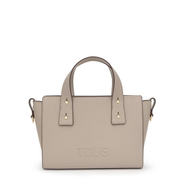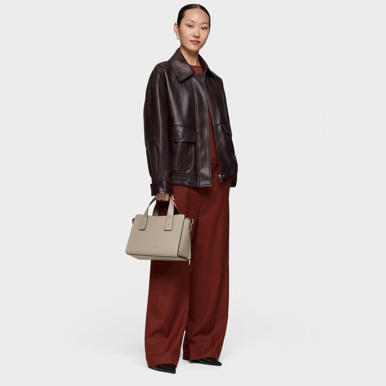 Bolso city mediano Back to basics de poliuretano en color topo. Cierre con mosquetón central. Bolsillo interior con cremallera. Asa fija de hombro. Medidas (alto x ancho x fondo): 15 x 33 x  20 cm.