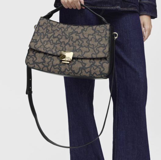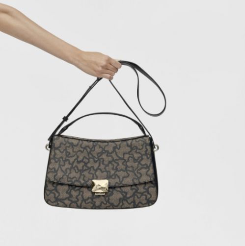 Bolsa bandolera city TOUS Kaos Icon de lona con detalles en piel sintética en color negro. Cierre de solapa a presión con mecanismo de apertura. Bolsillo interior abierto. Asa de mano fija y asa bandolera ajustable. Medidas (alto x ancho x fondo): 21,5 x 35 x 13 cm.