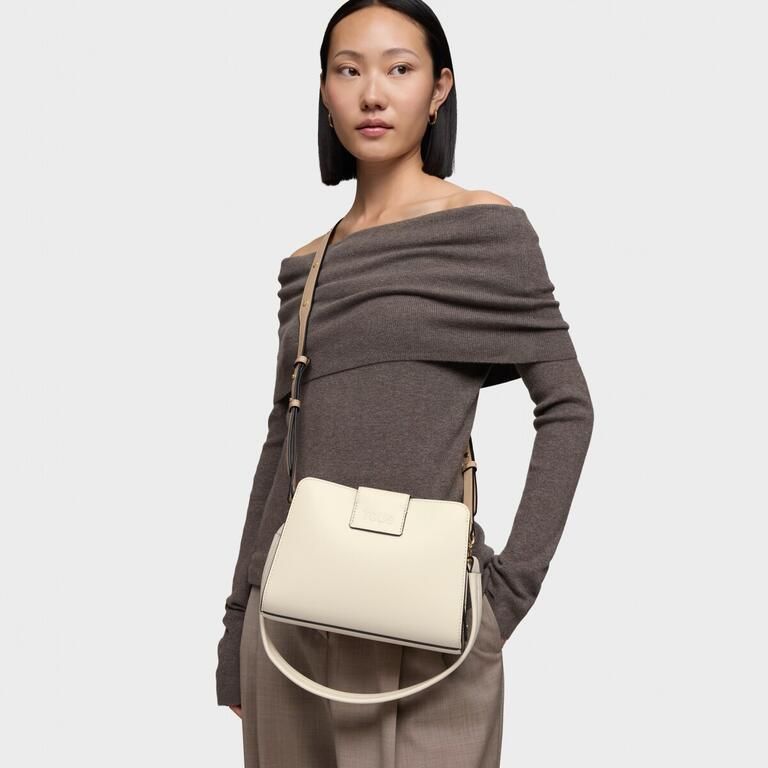 Bolso city pequeño Kaos Icon de poliuretano en color arena. Cierre con botón magnético. Bolsillo interior con cremallera. Asa fija de hombro. Medidas (alto x ancho x fondo): 16 x 23 x 11 cm.