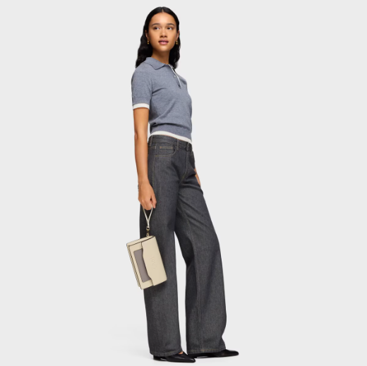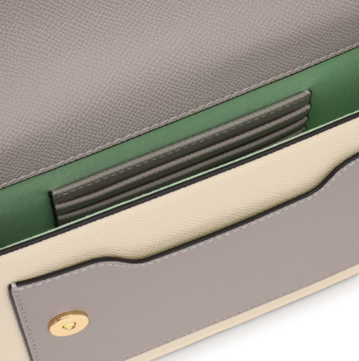 Bolsa clutch Audree Saffiano de poliuretano en color beige y gris. Cierre con botones a presión. En el interior cuenta con cuatro ranuras para tarjetas. Bolsillo exterior abierto. Asa de mano extraíble.