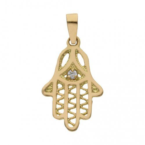Colgante Mano de Fátima fabricada en oro de 18 Ktes. y circonita.