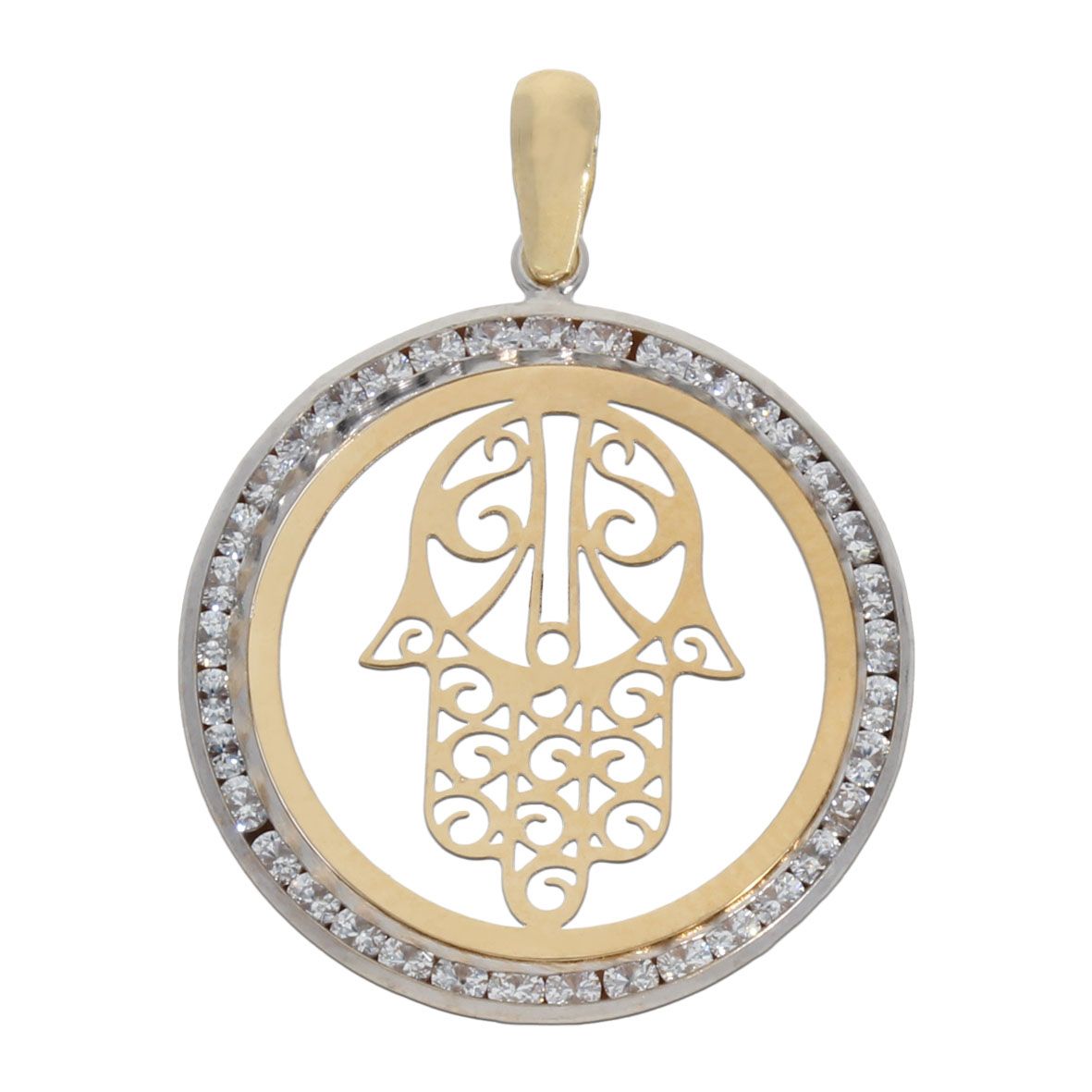 Colgante Mano de Fátima fabricado en oro de 18 kilates y zirconitas.
