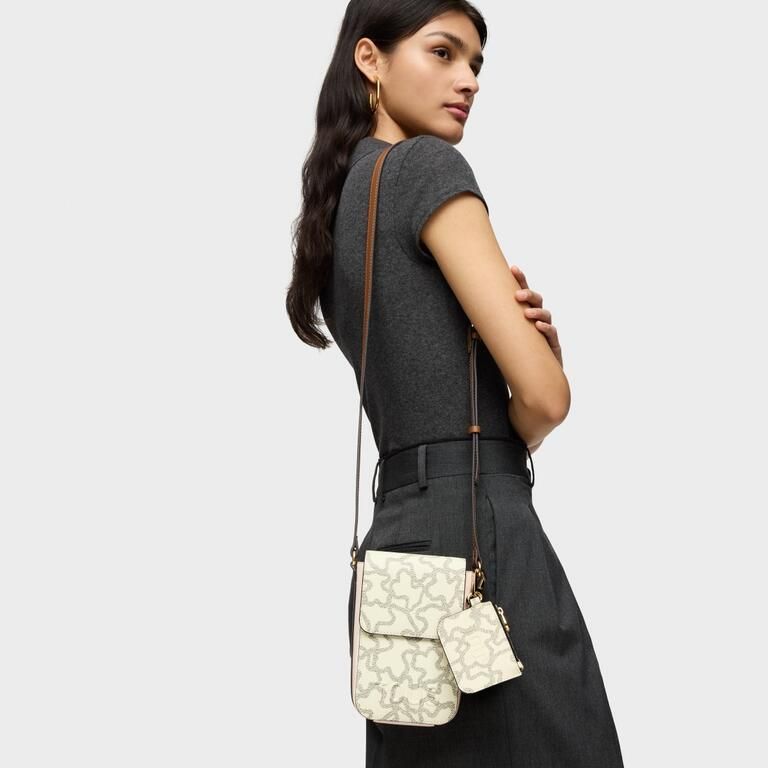 Funda de móvil colgante Kaos Icon de lona con detalles de piel sintética en color beige. Cierre de botón magnético. Tiene dos ranuras para tarjetas, una de ellas transparente. Asa bandolera ajustable.