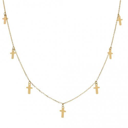 Gargantilla de oro 18 kilates con mini charms de cruces. Medida de los mini charms 7 mm. Terminación en brillo. Incluye cadena forzada de 1 mm. con opción de colocar la cadena en dos posiciones, 40 y 45 cms.