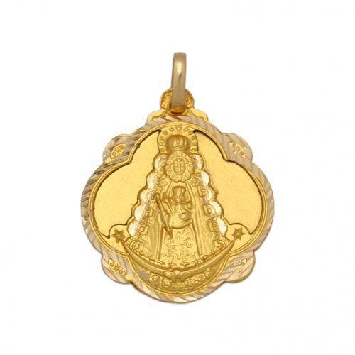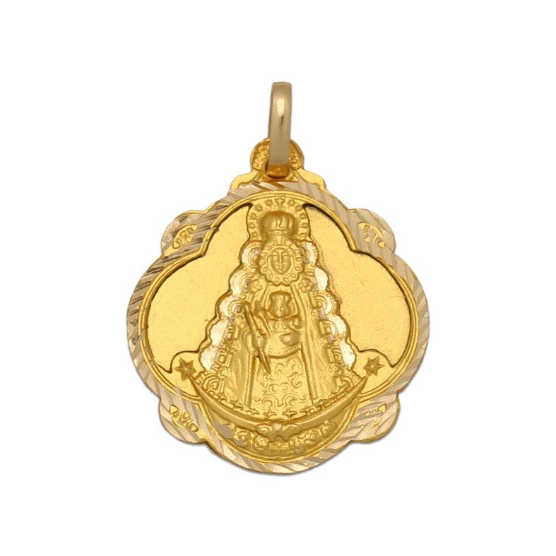 Medalla Virgen del Rocío fabricada en oro de 18 kilates con borde tallado.