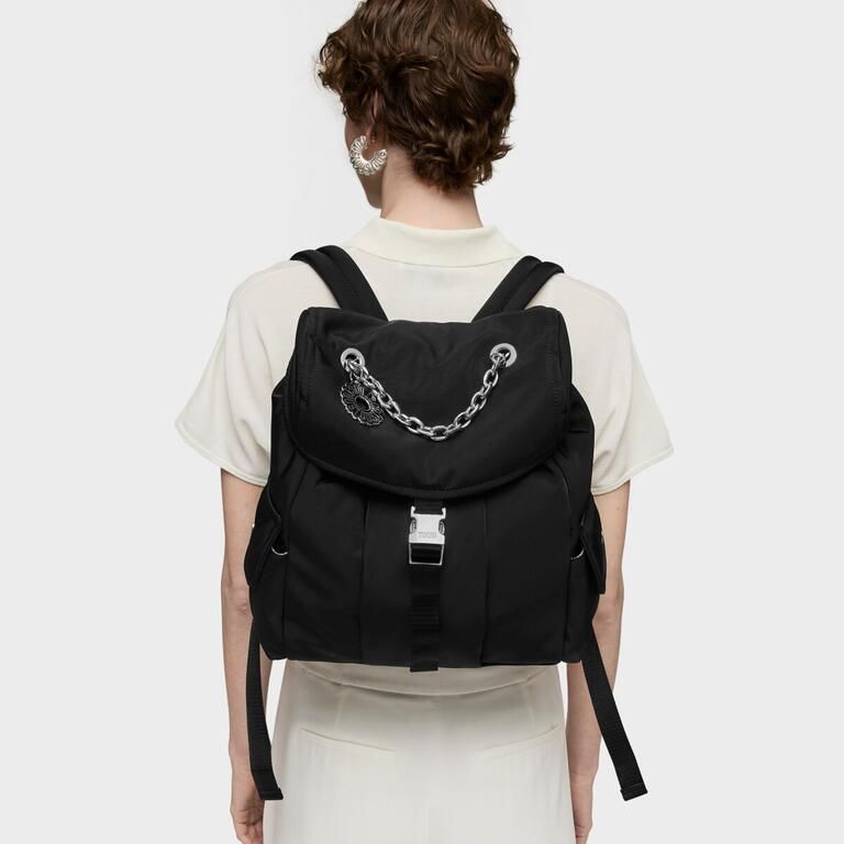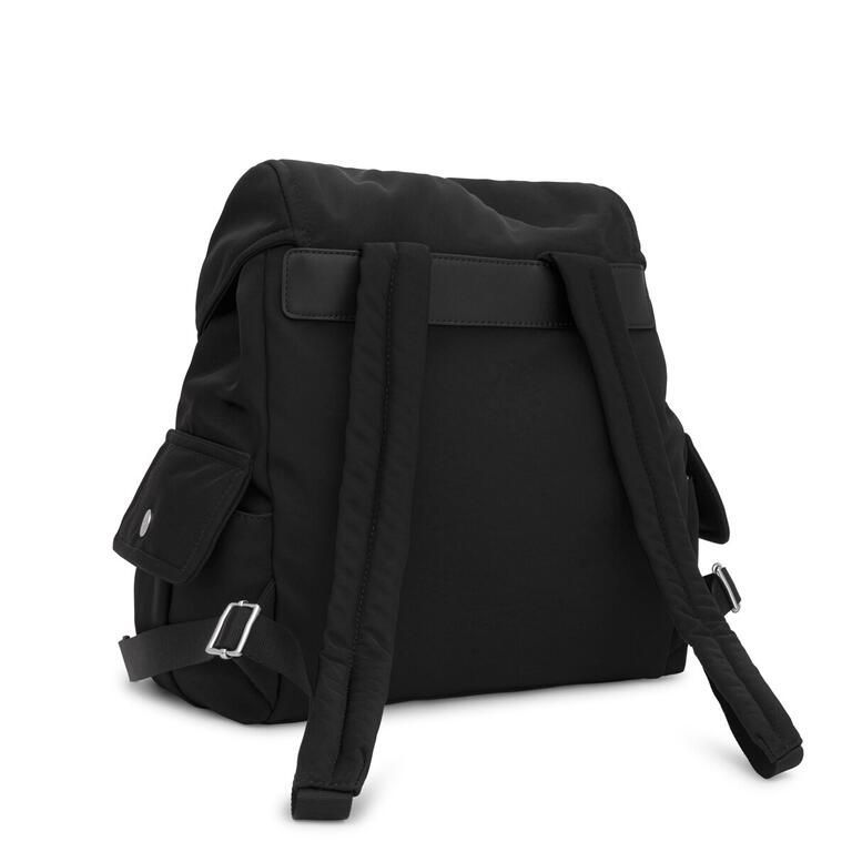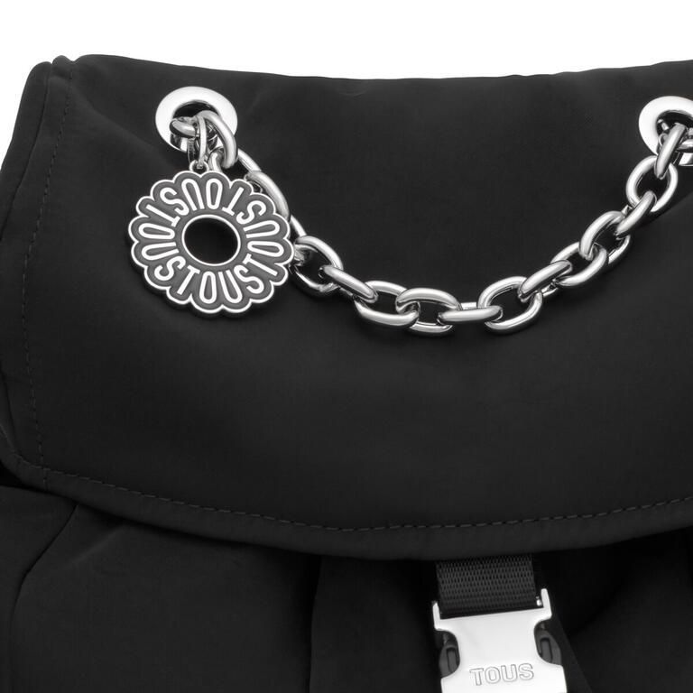 Mochila grande TOUS Jane Soft de nilón reciclado con detalles de piel sintética en color negro. Cierre estrangulador con solapa y hebilla. Dos bolsillos exteriores con cierre de botón y bolsillo interior con cierre de cremallera. Asa fija de mano y asas de hombro ajustables.