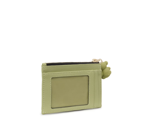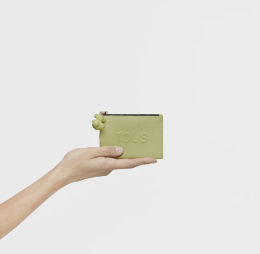 Monedero tarjetero TOUS La Rue New de piel sintética en color verde. Compartimento especial para monedas con cierre de cremallera. En la parte trasera cuenta con tres ranuras para tarjetas, una de ellas transparente.