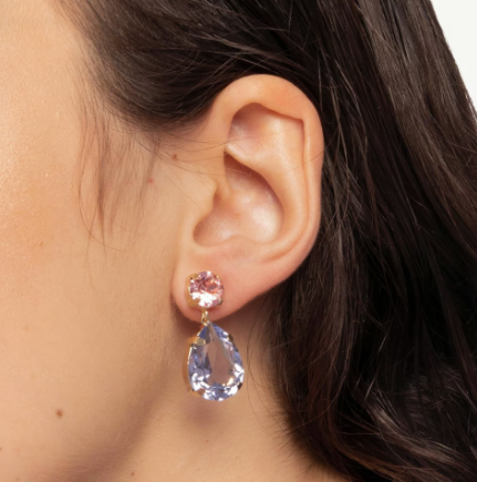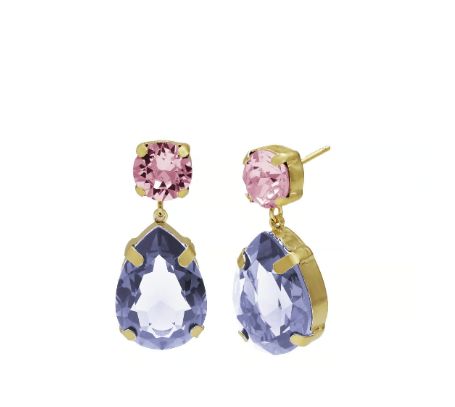 Pendientes largos de plata en dorado con forma de lágrima y cristales en color morado y rosa de la colección Blooming.