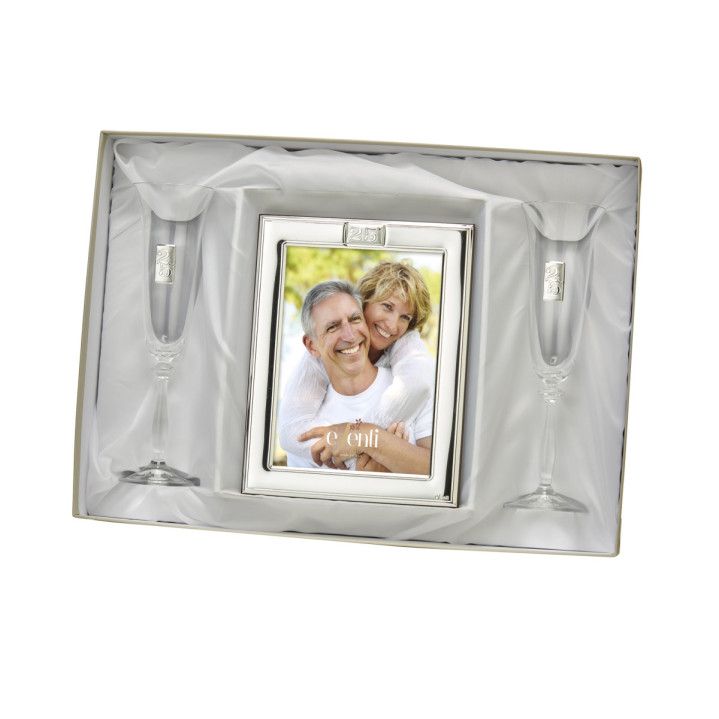 Set compuesto por porta fotos para 25 Aniversario fabricado en plata bilaminada de tamaño 13x18 cm. y copas con apliques de 25 Aniversario en plata bilaminada.