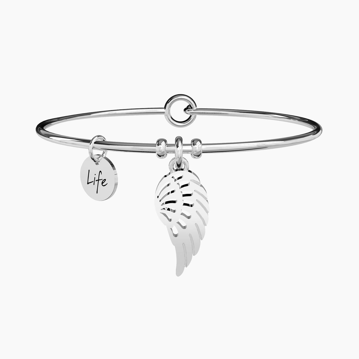 Pulsera de acero con colgante en forma de ala.
