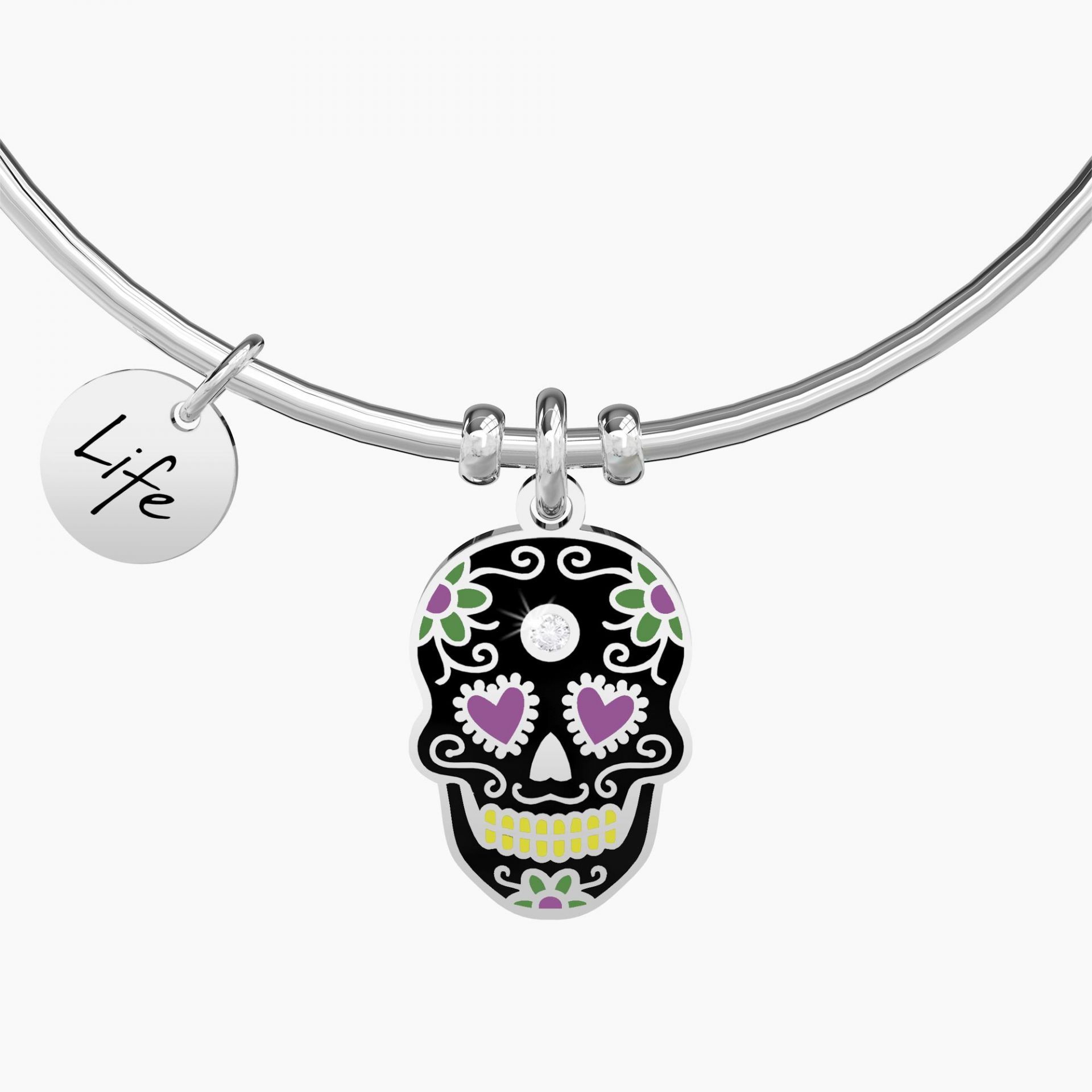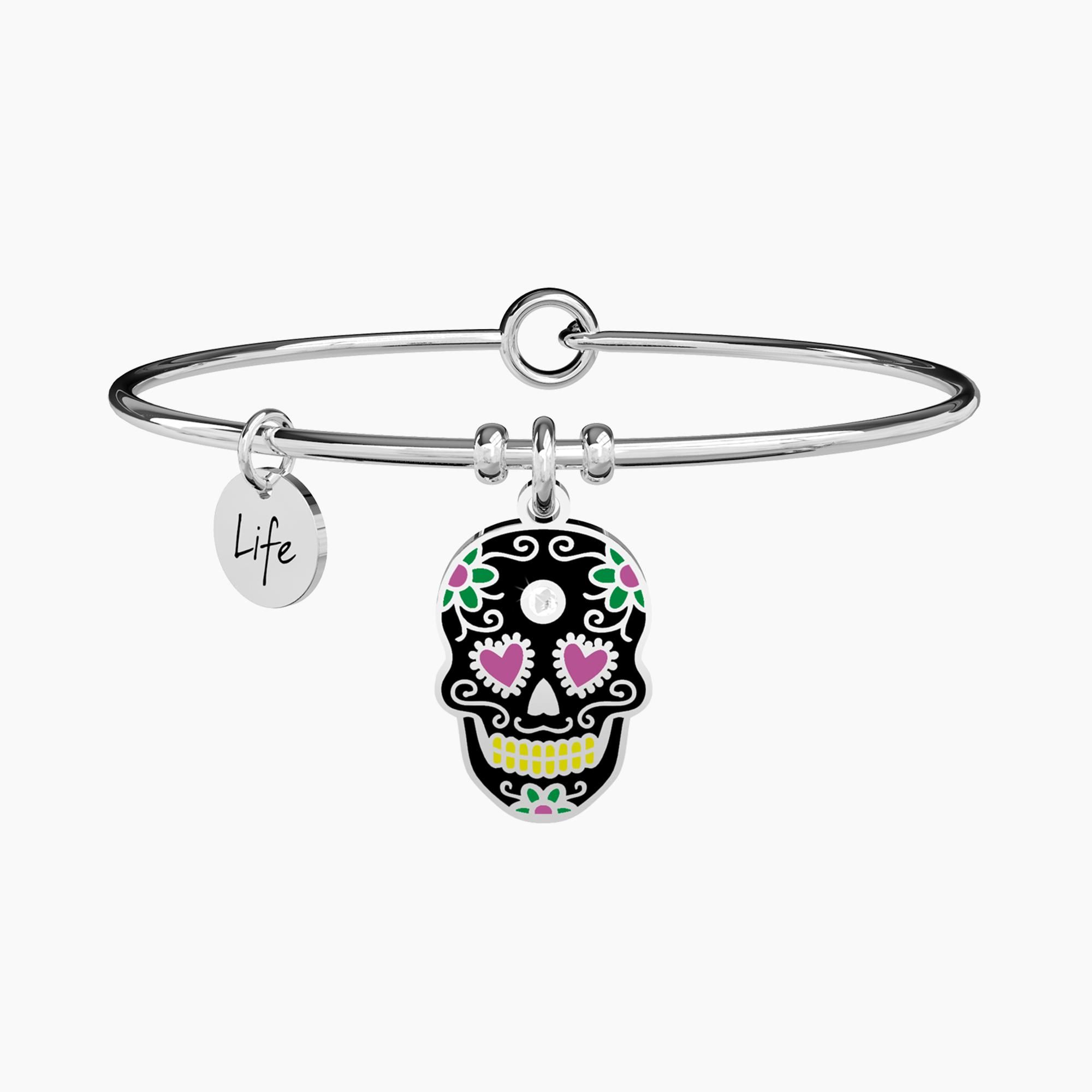 Pulsera de acero con colgante esmaltado en forma de calavera mejicana.