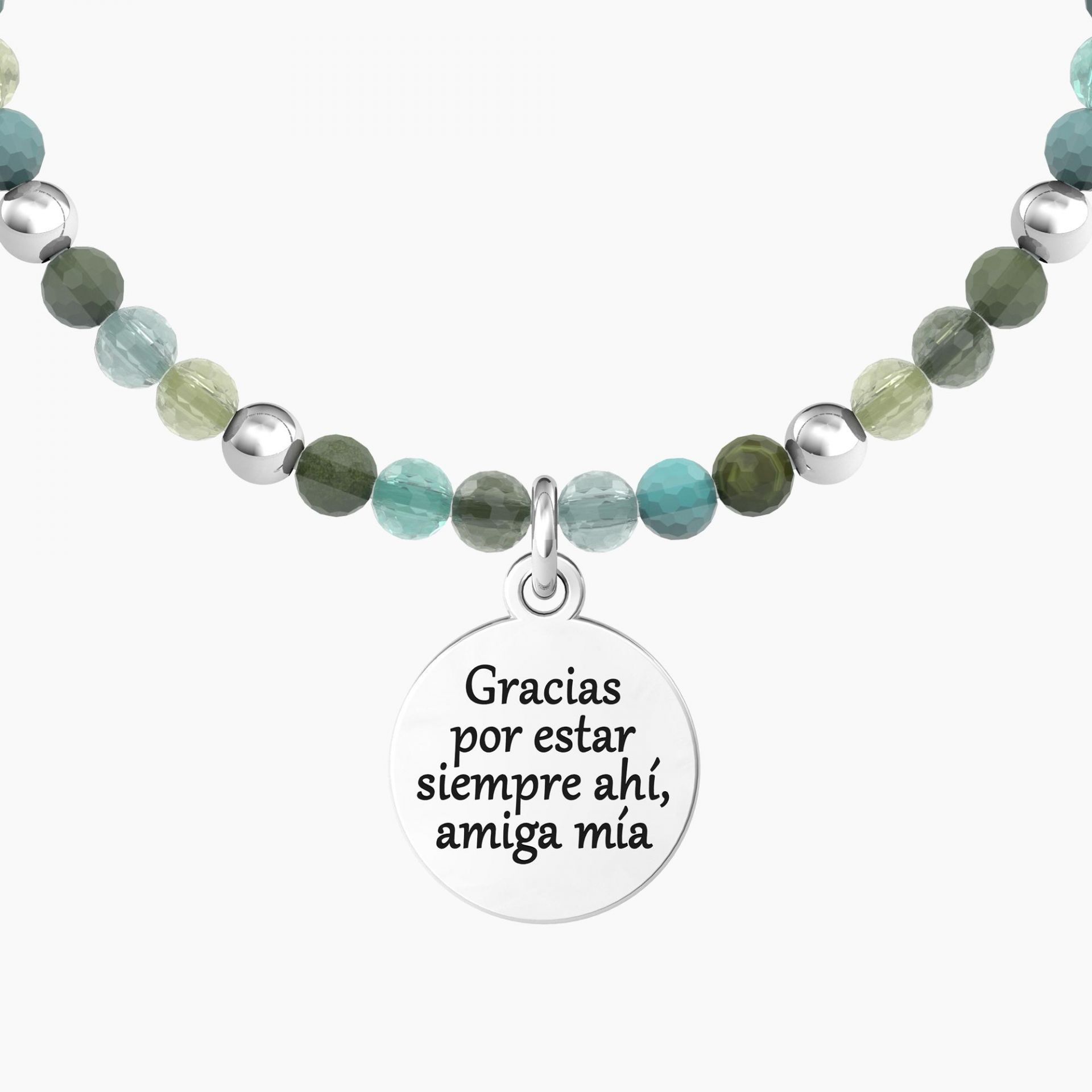 Pulsera elástica de acero con ágata estriada multicolor y colgante redondo con estrella de cristales blancos y frase “Gracias por estar siempre ahí, amiga mía!“.