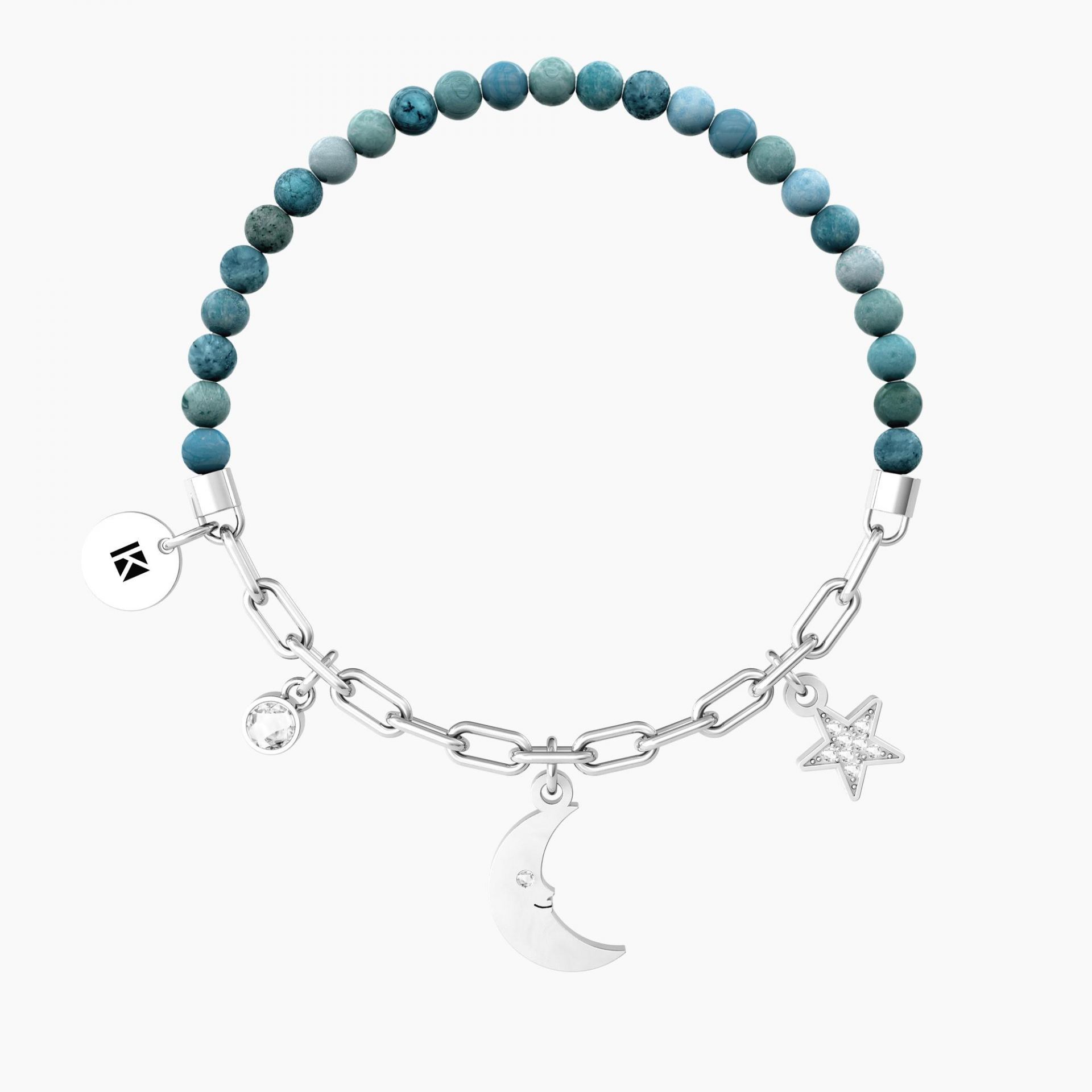 Pulsera de acero, mitad con ágata estriada azul y mitad con cadena alargada y colgantes en forma de luna y de estrella con cristales blancos.