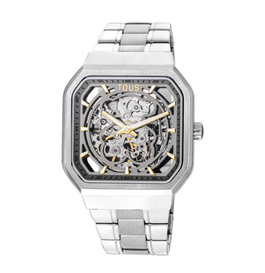Reloj analógico automático TOUS D-Bear con brazalete de acero y engranaje visible IP dorado con la silueta de un oso en la parte frontal. Funciones: horas y minutos. Impermeable a 3 ATM. Movimiento mecánico automático esqueleto japonés.