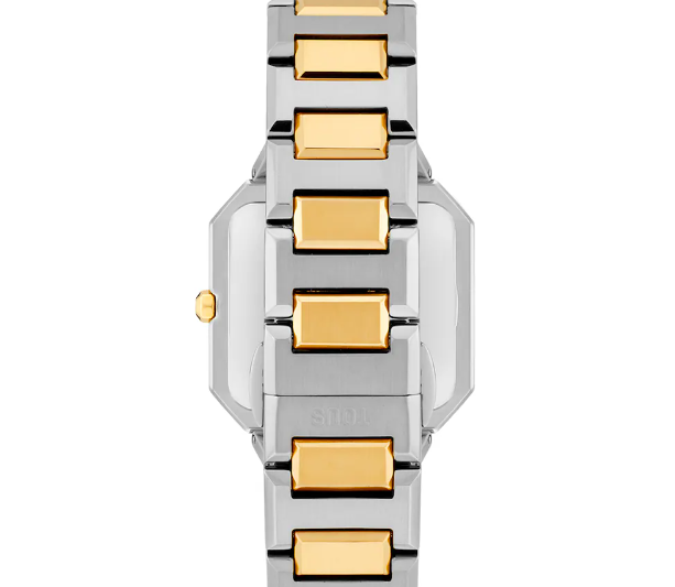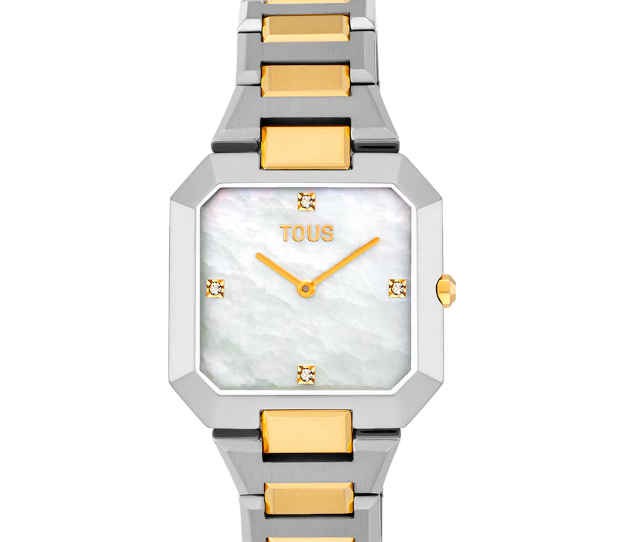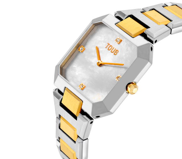 Reloj analógico TOUS Karat con brazalete de acero inoxidable y acero dorado. Dimensiones: 30,5 mm. Esfera de nácar con cristales facetados en los índices. Cristal mineral plano octogonal. Funciones: hora y minutos. Impermeable a 3 ATM. Movimiento analógico de cuarzo japonés. Brazalete: 86,9mm x 21,3mm x 16mm / 77,2mm x 21,3mm x 16mm. Cierre mariposa con pulsadores.