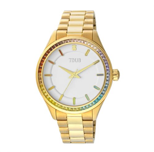 Descubre el reloj que se adapta a tu estilo. Con brazalete de acero IP dorado y zirconias engastadas con efecto arcoiris, forma parte de la colección T-Shine y destaca por su versatilidad y diseño. Pura personalidad.