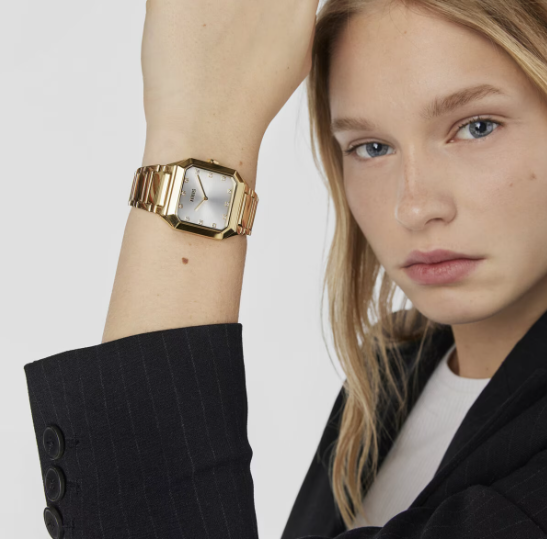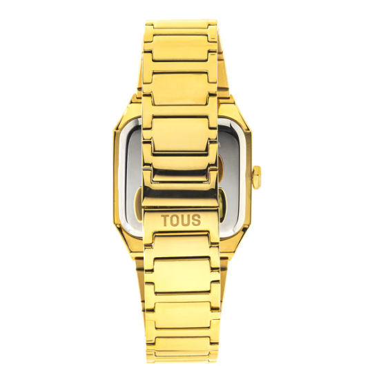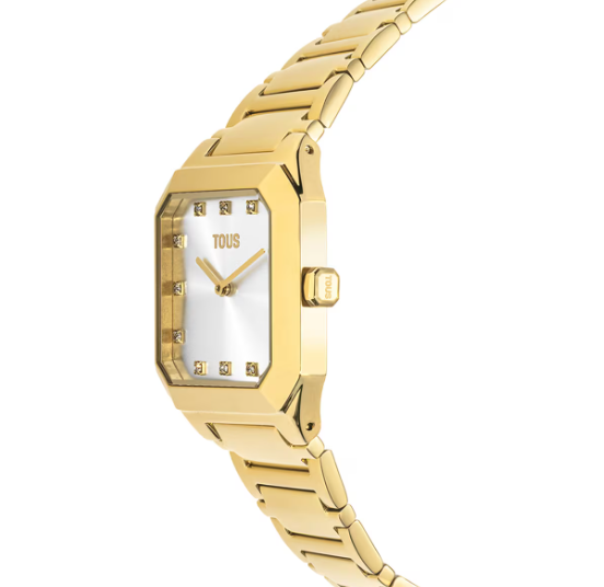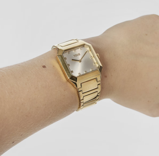 Reloj analógico TOUS Karat Squared con brazalete de acero IPG dorado 316L, dimensiones 32 x 34 mm y esfera de metal con cristales facetados en los índices. Funciones: hora y minutos. Impermeable a 3 ATM. Batería: 1,55V Oxido de plata SR621SW/0,3 gramos. Movimiento cuarzo japonés. Cierre desplegable con pulsadores.