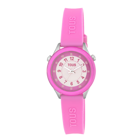 Reloj analógico TOUS Mini Self Time de acero inoxidable 316L y brazalete de silicona fucsia. Dimensiones: 30 mm. Funciones: hora, minutos y segundos. Impermeable a 3 ATM. Batería: 1,55V Oxido de plata SR626SW/0,3 gramos. Cristal mineral redondo plano. Movimiento cuarzo japonés. Cierre hebilla.