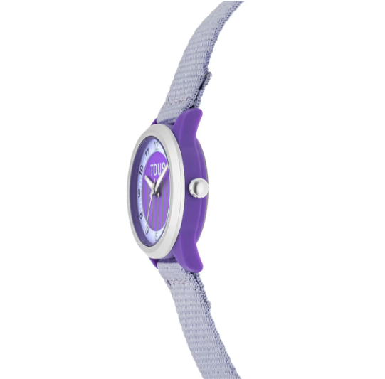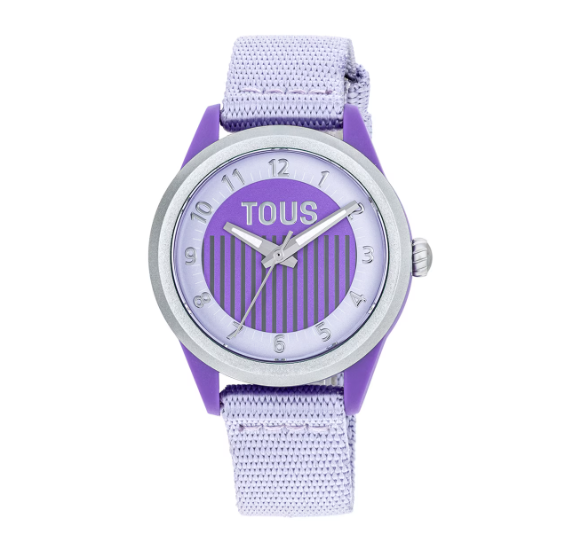 Reloj analógico TOUS Mini Vibrant Sun con caja de plástico reciclado de color malva. La correa es de poliéster reciclada, fabricada a partir de botellas de plástico. Bisel de aluminio parcialmente reciclado. Funciones: hora, minutos y segundos. Impermeable: 3 ATM. Batería: 1,55V. Diámetro reloj: 30 mm. Movimiento de cuarzo japonés. Requiere de pila para funcionar. Cierre hebilla.