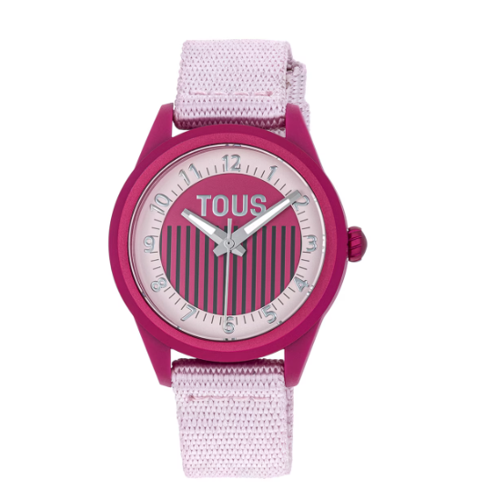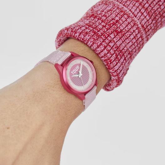 Reloj analógico TOUS Mini Vibrant Sun con caja de plástico reciclado de color rosa. La correa es de poliéster reciclada, fabricada a partir de botellas de plástico. Bisel de aluminio parcialmente reciclado. Funciones: hora, minutos y segundos. Impermeable: 3 ATM. Batería: 1,55V. Diámetro reloj: 30 mm. Movimiento de cuarzo japonés. Requiere de pila para funcionar. Cierre hebilla.