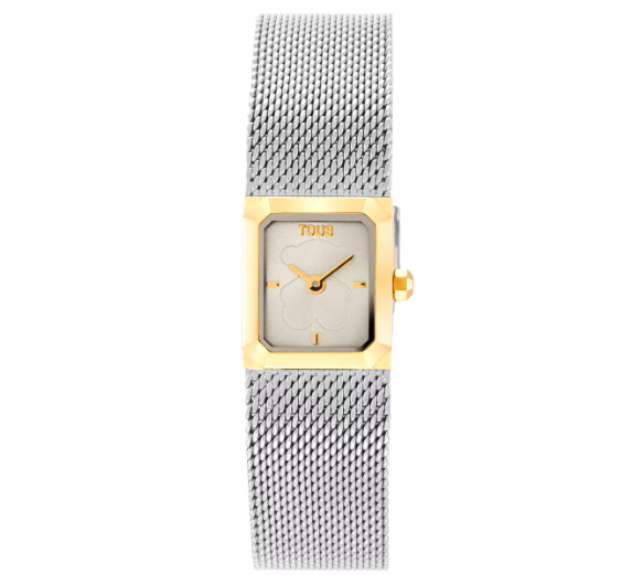 Reloj analógico TOUS MiniMesh con brazalete de malla milanesa de acero inoxidable y acero dorado. Dimensiones: 16,3 mm x 18,8 mm. Cristal: mineral plano octogonal. Funciones: hora y minutos. Impermeable a 3 ATM. Brazalete: 16mm x 16mm x 70mm / 16mm x 16mm x 110mm. Cierre ajustable con cierre de seguridad.