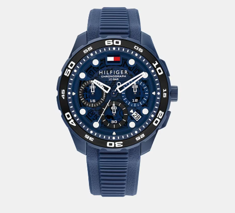 Reloj Tommy Hilfiger para hombre de la colección TH-Regatta fabricado en acero inoxidable y silicona en color azul. Estamos ante un atractivo reloj de diseño deportivo compuesto por caja de 44mm de diámetro con bisel de aluminio negro con esfera azul que cuenta con indicadores luminiscentes al igual que sus agujas movidas por mecanismo de cuarzo analógico con función de cronógrafo y calendario. Todo ello protegido por cristal mineral. Su brazalete es de silicona con cierre de hebilla. Resistente al agua hasta 5 ATM.