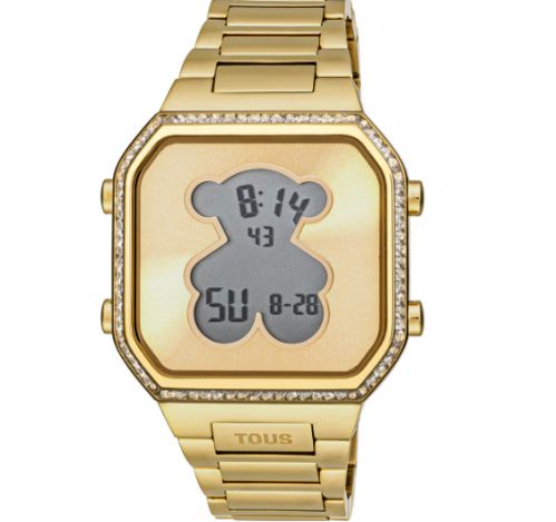 Reloj digital D-BEAR con brazalete de acero IPG dorado y bisel con 80 zirconitas cubicas CZ engastadas en carril. Diámetro caja: 36,5 x 44,8 mm. Funciones: hora, minutos, segundos, día, mes i día de la semana, cronógrafo 1/100 segundos y alarma. Impermeable a 3 ATM. Batería: 3V litio CR2016 / 1,69 gramos (litio 0,025 gramos). Cristal: vidrio endurecido plano con forma de oso. Cierre desplegable con pulsadores.