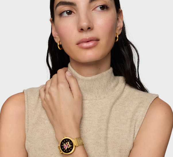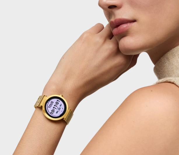 Reloj smartwatch con caja y brazalete de malla milanesa de acero inoxidable en color dorado. Diámetro: 36,5 mm. Cristal de vidrio redondo endurecido plano. Impermeable IP68. Pantalla AMOLED táctil redonda de 1,04 pulgadas (Full Touch) con resolución 340 x 340. Procesador/Chipset: Realtek RTL8773EWE-VP y sensor de frecuencia cardíaca HRS 3300 (ARM Cortex-M0, 53 MHz). Compatible con Android 7.0 y iOS 12.0 o superior. Bluetooth BLE 5.3 con ganancia de antena 4 dBi. Memoria RAM: 128 KB; ROM Flash: 128 MB; sistema operativo: RT OS. Capacidad de batería: 130 mAh, 3,8 V litio / 4 gramos, recargable con cable magnético (mín. 5V/1A). Autonomía: aproximadamente 3 días en funcionamiento y 5-7 días en reposo. Funciones: 6 esferas + 2 siempre encendidas en blanco y negro + 4 esferas intercambiables desde la TOUS WEAR APP donde puedes personalizar tu avatar; horas, minutos, mes, día, día de la semana; actividad diaria con contador de pasos, calorías y distancia (millas o km); múltiples deportes (caminar, correr, cinta, senderismo, ciclismo, elíptica, saltar la cuerda, remo, bicicleta estática, fuerza, tenis, baloncesto, bádminton, tenis de mesa, lazy car, béisbol, rugby); frecuencia cardíaca, monitorización del sueño, oxígeno en sangre (aproximación), función ovárica, relax; notificaciones (llamadas, WhatsApp, email, SMS, Facebook, Instagram, etc.); tiempo, calendario, calculadora, control de música y cámara, alarmas. Brazalete medidas: 12h: 18 mm x 16 mm x 86,65 mm / 6h: 18 mm x 16 mm x 107,97 mm. Cierre de malla milanesa ajustable con seguridad.