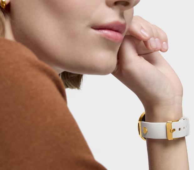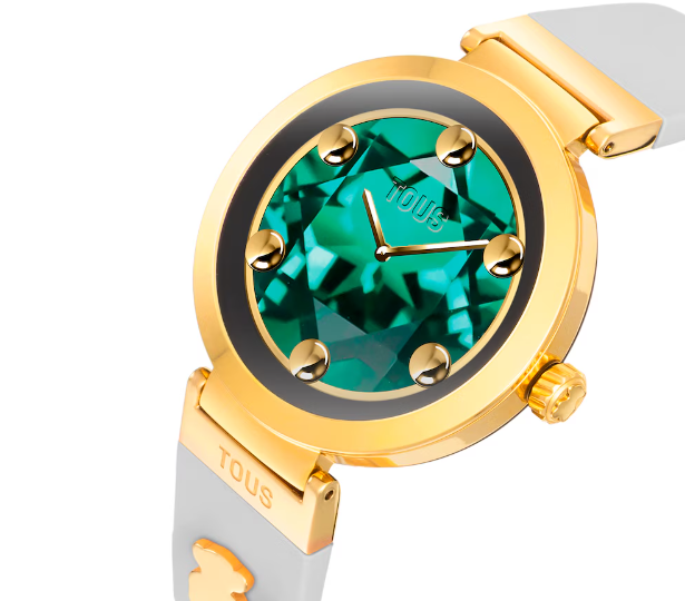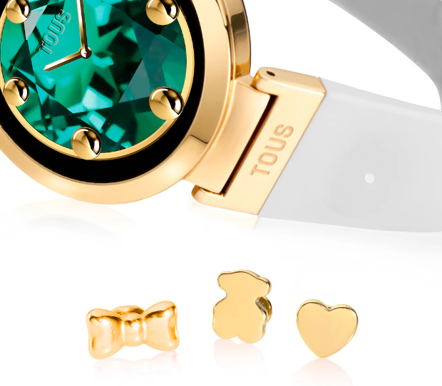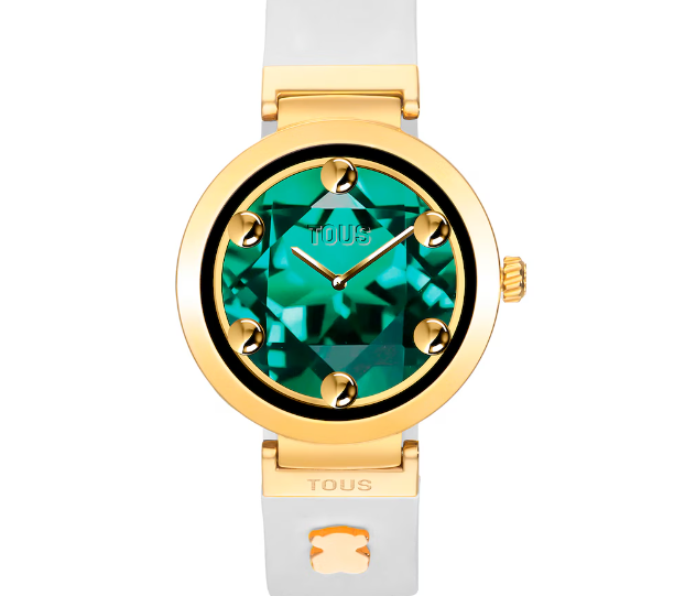 Reloj smartwatch con caja de acero inoxidable en color dorado y correa de silicona en color beige con tres charms intercambiales. Diámetro: 36,5 mm. Cristal de vidrio redondo endurecido plano. Impermeable IP68. Pantalla AMOLED táctil redonda de 1,04 pulgadas (Full Touch) con resolución 340 x 340. Procesador/Chipset: Realtek RTL8773EWE-VP y sensor de frecuencia cardíaca HRS 3300 (ARM Cortex-M0, 53 MHz). Compatible con Android 7.0 y iOS 12.0 o superior. Bluetooth BLE 5.3 con ganancia de antena 4 dBi. Memoria RAM: 128 KB; ROM Flash: 128 MB; sistema operativo: RT OS. Capacidad de batería: 130 mAh, 3,8 V litio / 4 gramos, recargable con cable magnético (mín. 5V/1A). Autonomía: aproximadamente 3 días en funcionamiento y 5-7 días en reposo. Funciones: 6 esferas + 2 siempre encendidas en blanco y negro + 4 esferas intercambiables desde la TOUS WEAR APP donde puedes personalizar tu avatar; horas, minutos, mes, día, día de la semana; actividad diaria con contador de pasos, calorías y distancia (millas o km); múltiples deportes (caminar, correr, cinta, senderismo, ciclismo, elíptica, saltar la cuerda, remo, bicicleta estática, fuerza, tenis, baloncesto, bádminton, tenis de mesa, lazy car, béisbol, rugby); frecuencia cardíaca, monitorización del sueño, oxígeno en sangre (aproximación), función ovárica, relax; notificaciones (llamadas, WhatsApp, email, SMS, Facebook, Instagram, etc.); tiempo, calendario, calculadora, control de música y cámara, alarmas. Correa con un icono extraíble y dos iconos adicionales en cajita. Correa medidas: 12h: 18 mm x 18 mm x 71,5 mm / 6h: 18 mm x 18 mm x 118,3 mm. Cierre hebilla.