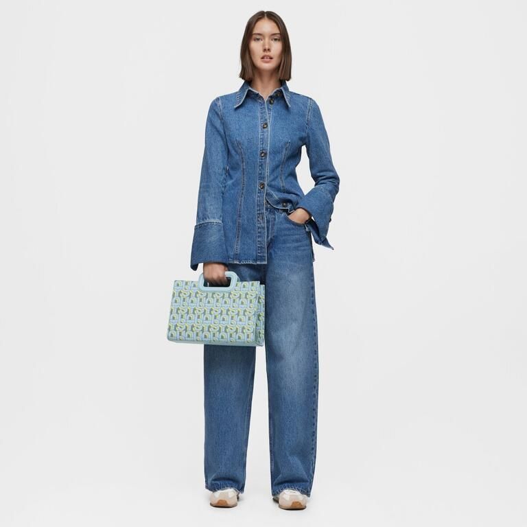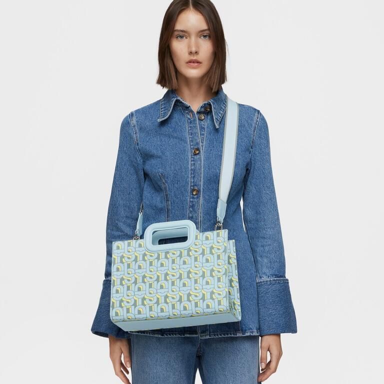Bolso shopper mediano Amaya TOUS MANIFESTO de lona con detalles en piel sintética y estampado en color azul claro. Cierre de cremallera. Bolsillo interior abierto. Asas fijas de mano y asa bandolera ajustable y extraíble.
