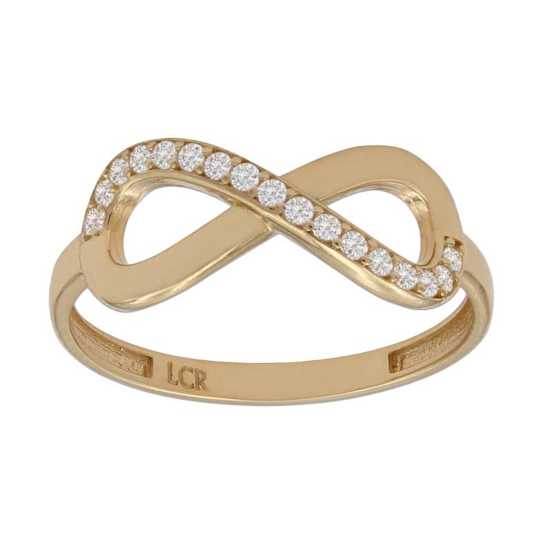 Sortija infinito fabricada en oro de 18 kilates y circonitas.